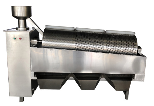 该机可单机使用也可与制丸机和提升机配套使用,提升机将成品药丸提升后经溜槽进入旋转的滚筒筛内,两节滚筒筛在主动摩擦胶轮的带动下,顺时针旋转,分别选出符合要求的各种丸剂。在筛选的过程中会出现丸剂直径正好与筛孔大小一致的情况,丸剂夹在筛孔上,这时安装在滚筒筛侧边的滚刷或硅胶压辊能将药丸挤出。